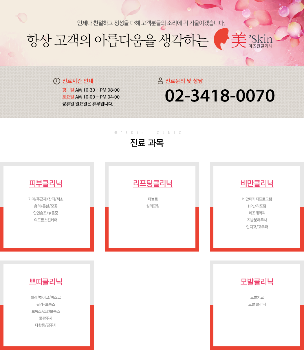 진료시간 최고의 고객만족을 추구하는 미즈킨입니다. 홈 > 미즈킨ABOUT > 진료시간 New arrival& EVENT 가격은 저렴하게, 효과는 확실하게 미즈킨의 새로운 프로그램 및 이벤트 놓치지 마세요.