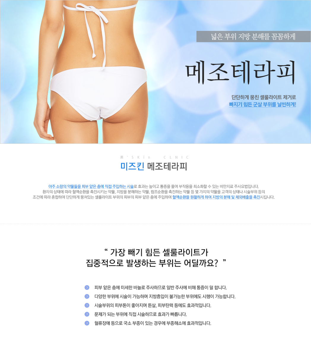 메조테라피 최고의 고객만족을 추구하는 미즈킨입니다. 홈 > 비만클리닉 > 메조테라피 New arrival& EVENT 가격은 저렴하게, 효과는 확실하게 미즈킨의 새로운 프로그램 및 이벤트 놓치지 마세요.