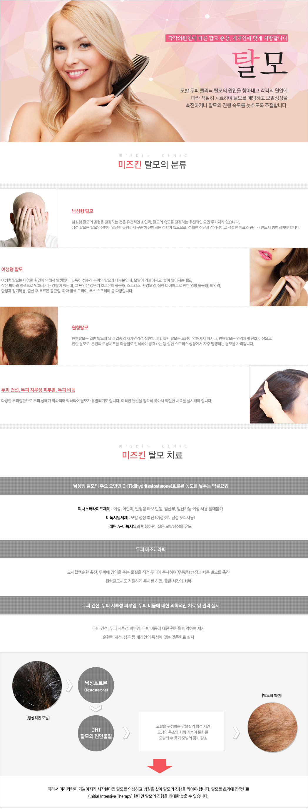 탈모 최고의 고객만족을 추구하는 미즈킨입니다. 홈 > 피부클리닉 > 탈모 New arrival& EVENT 가격은 저렴하게, 효과는 확실하게 미즈킨의 새로운 프로그램 및 이벤트 놓치지 마세요.